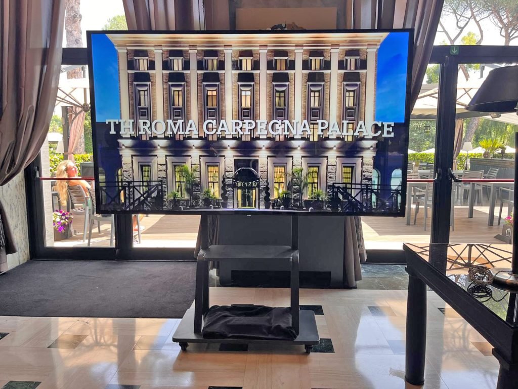 Il monitor LCD Dahua DHI-LM98-S400 da 98” che riproduce l’immagine della facciata dell’hotel. Adatto al funzionamento h24, sette giorni su sette, è comodamente trasportabile da un ambiente all’altro in base alle esigenze di comunicazione.