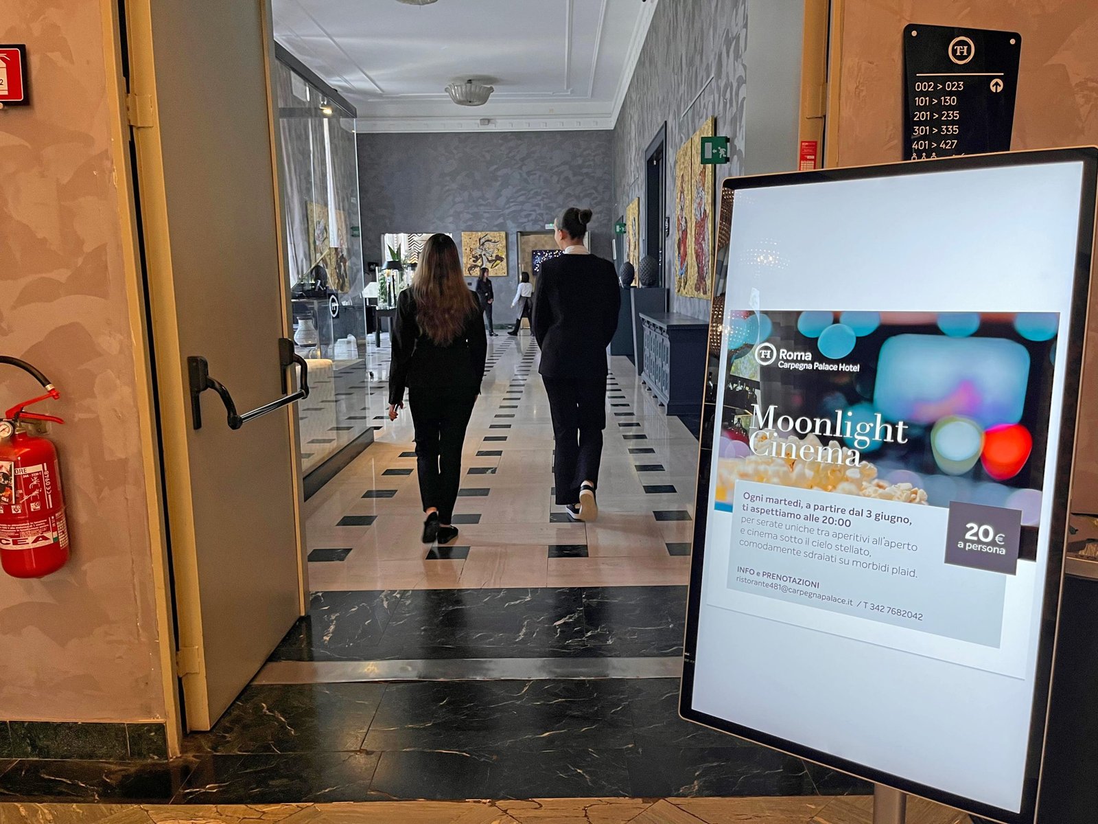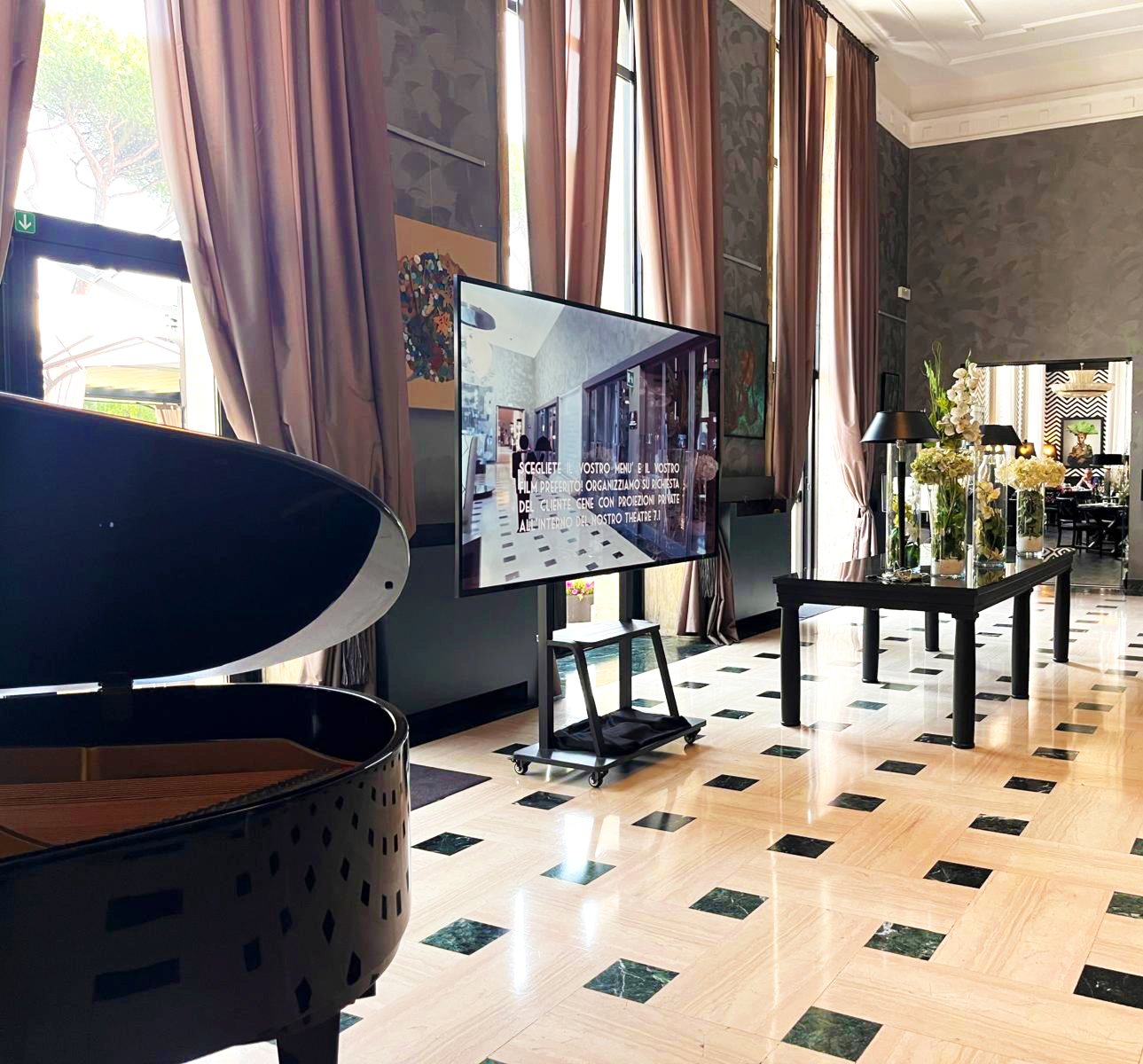 Dunque, il nostro bisogno era quello di comunicare agli ospiti i molteplici eventi del giorno e l’agenda delle diverse sale attraverso una segnaletica digitale puntuale ma non invasiva, che rispettasse l’eleganza e la bellezza del luogo e che, allo stesso tempo, consentisse al personale di poter gestire ogni giorno contenuti diversi in maniera semplice, rapida e precisa, oltre che più accattivante».