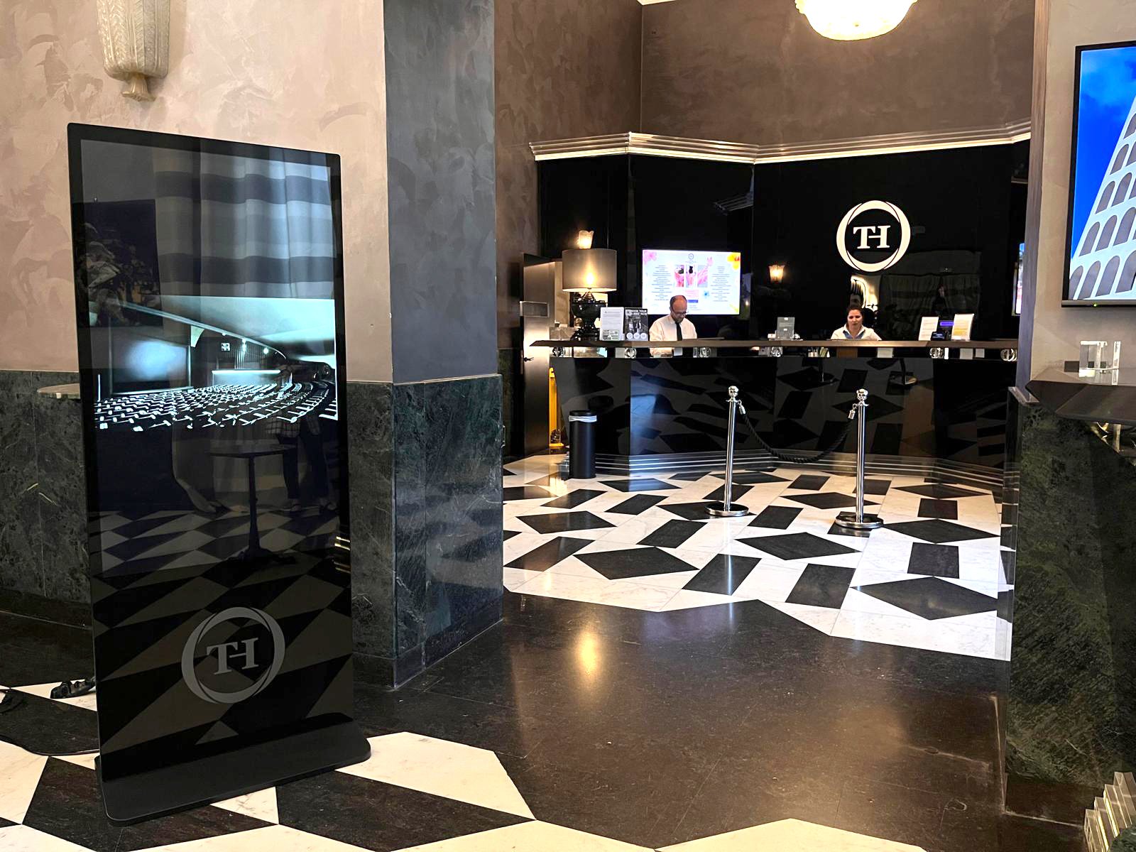 Il totem indoor Dahua DHI-LDV55-SAI400L con schermo LCD verticale da 55” posizionato all’ingresso dell’albergo, riproduce un’immagine dell’Auditorium facendo emergere il valore aggiunto di questa struttura.