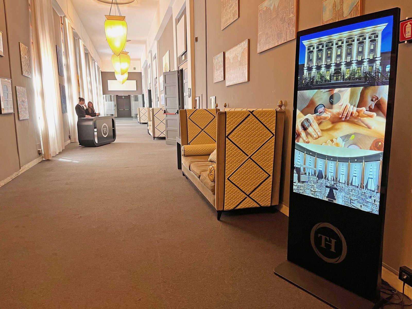Il display Dahua LM32- Explorer, qui collocato in prossimità di un punto di passaggio dell’hotel, propone agli ospiti un evento.
