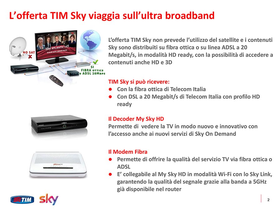 Tutta l’offerta televisiva di Sky da oggi sulle reti di nuova generazione di Telecom Italia grazie alla piattaforma IP e al decoder My Sky HD dedicato. Inizia l’era del quadruple play: per la prima volta in Italia i servizi di telefonia fissa e mobile, internet e tv integrati. La valenza strategica di questa partnership apre nuove prospettive di crescita per entrambe le aziende e dà un contributo determinante alla diffusione della banda ultralarga.