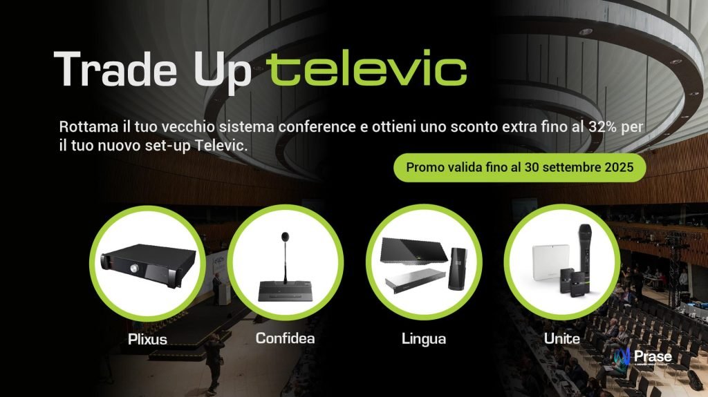 News dal mondo Prase – Prase Media Technologies annuncia il lancio della promozione Trade Up Televic, valida fino al 30 settembre 2025, che offre ai professionisti AV la possibilità di aggiornare il proprio sistema conference con uno sconto extra fino al 32%.