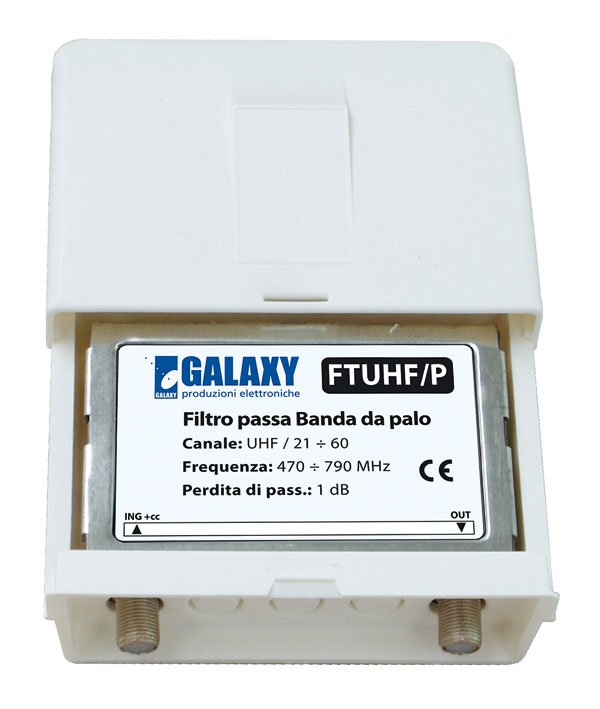 Una delle condizioni che possono verificarsi è che i segnali emessi dalle celle LTE ‘accechino’ i centralini, provocando fenomeni di intermodulazione e di saturazione, con conseguente drastico peggioramento della qualità (BER e MER) dei segnali di uno o più multiplex ricevuti. Per ovviare a questi inconvenienti è necessario interporre fra l’antenna UHF e il centralino un filtro passa basso, in grado di tagliare la banda passante al canale 60, impedendo quindi il passaggio dei canali da 61 a 69. Galaxy ha sviluppato tre tipi di filtri LTE: due modelli da interno e uno da esterno, installabile direttamente sul palo di sostegno delle antenne. Il modello FTUHF/F, da interno, è dotato di connettori F, maschio e femmina, in modo da poter essere inserito lungo la linea di distribuzione. Il modello FTUHF/I differisce dal modello con connettori F solo per la dotazione di connettori tipo IEC, ancora molto diffusi negli impianti di distribuzione seppure con il definitivo passaggio alla tv digitale si preferiscano i connettori F. Il modello FTUHF/P, invece, è da esterno in contenitore stagno, da fissare al palo di sostegno delle antenne. Le caratteristiche, per tutti, sono: perdita di passaggio pari a 1 dB; banda passante da 470 a 790 MHz, attenuazione dei canali 61÷ 69 da 15 a 25 dB.