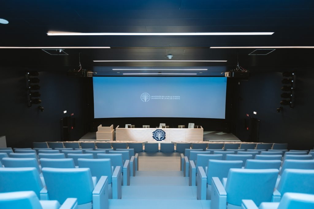 La spettacolare aula magna dell’Università della Valle d’Aosta. Lo schermo curvilineo realizzato su misura permette di ottenere una videoproiezione immersiva.