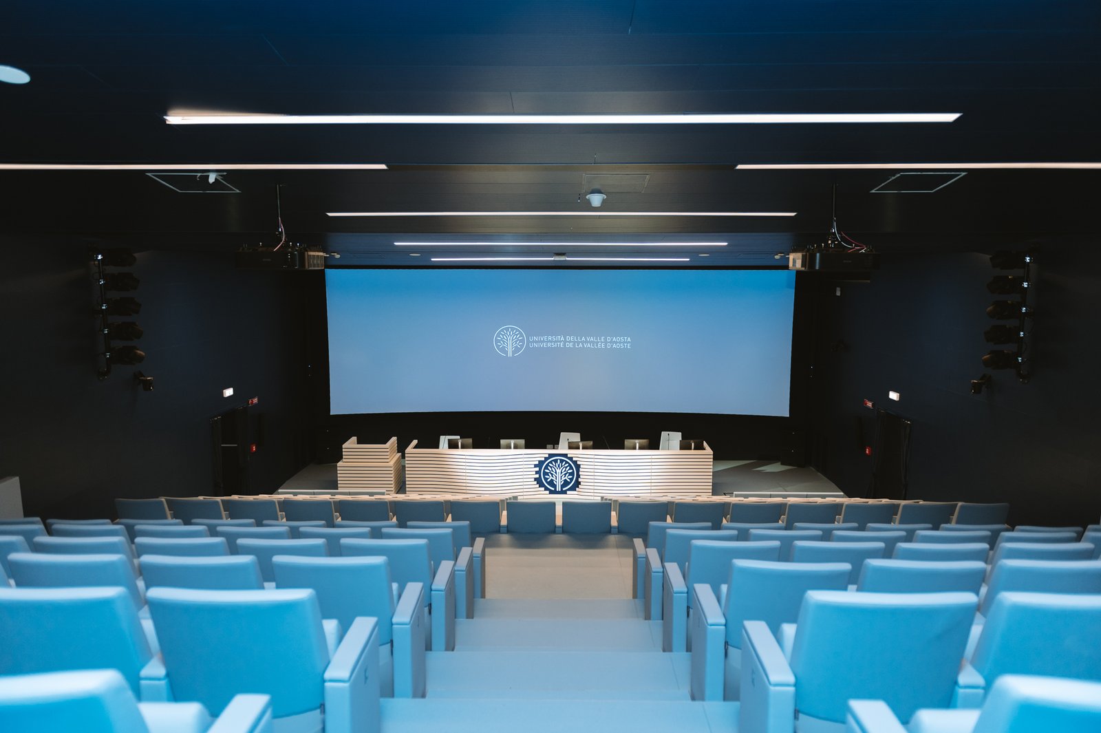 La spettacolare aula magna dell’Università della Valle d’Aosta. Lo schermo curvilineo realizzato su misura permette di ottenere una videoproiezione immersiva.
