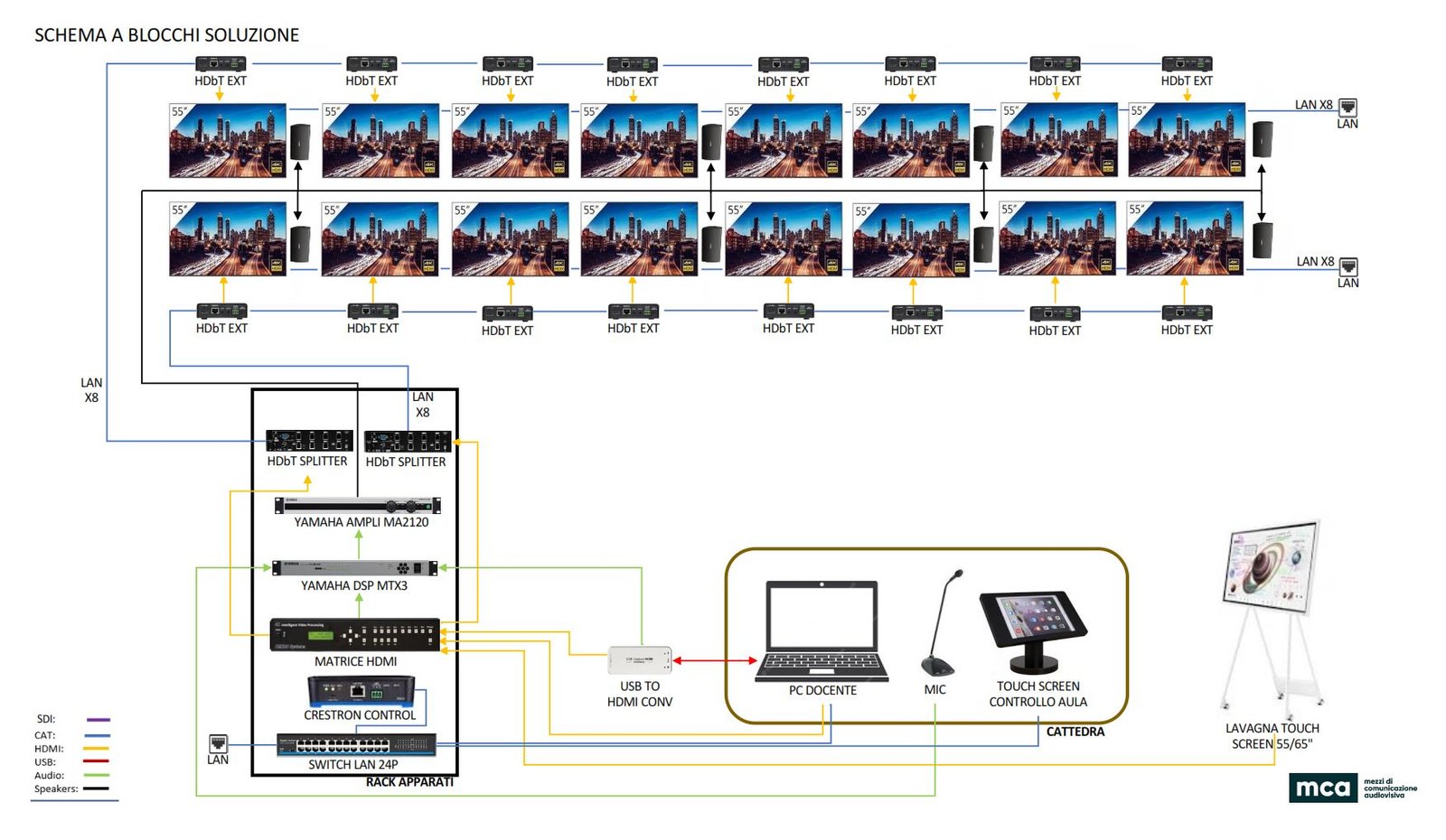 Nelle aule sono disponibili scenari personalizzati, selezionabili dopo l’accensione della sala e la preparazione dello scenario predefinito. In presenza, gli studenti fruiscono le lezioni anche tramite monitor, che garantiscono una visione ottimale. Marazzi prosegue: «All’interno delle aule è stata installata una serie di monitor Sony, generalmente sedici, affiancati a coppie di due. Il professore rimane al centro, a destra ci sono otto monitor affiancati a coppie, e lo stesso a sinistra, in modo da coprire tutta l’aula. In base a dove si è seduti, può essere più comodo guardare i monitor da una parte o dall’altra. Con questa configurazione garantiamo una qualità delle immagini davvero elevata con una fedeltà colorimetrica eccellente. I monitor Sony, poi, offrono una luminosità di quasi 500 candele e il comfort visivo è assicurato ovunque ci si sieda». Gli studenti sono sempre al centro, anche grazie alla possibilità di utilizzare i propri dispositivi: nelle nuove aule infatti, ai banchi fissi con ribaltina viene fornita alimentazione per laptop, tablet o smartphone. Ma entriamo un po’ più nel dettaglio dei prodotti, tutti forniti da Exertis, società con cui MCA collabora da lungo tempo. La voce è sempre quella di STIM Tech Group. «Abbiamo una matrice scaler di Kramer o Gefen con vari ingressi HDMI e due uscite HDBaseT; queste due uscite sono collegare a loro volta a due splitter a otto uscite; con questa configurazione distribuiamo lo stesso segnale su tutti i monitor dell’aula. Ogni monitor ha un ricevitore HDBaseT che converte il segnale in HDMI; inoltre, ogni monitor è collegato in rete con un cavo Lan. Il computer di sala funge anche da streamer -l’università ha infatti la possibilità di trasmettere in streaming la lezione per poterla gestire in modalità on demand- e permette inoltre di collegare il laptop del professore in HDMI dalla cattedra».