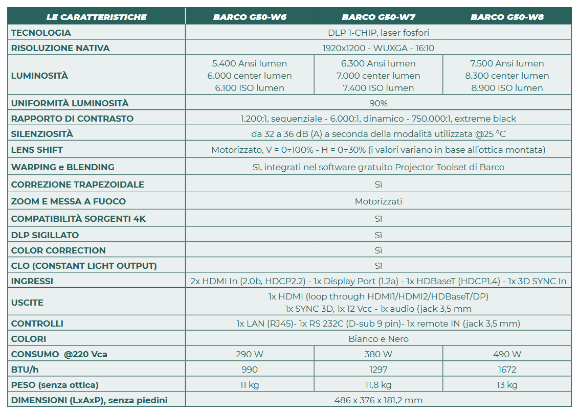 I nuovi proiettori Barco serie G50 sono dotati di sensore 1-chip DLP e sono disponibili in tre diverse luminosità, da 5.400 a 7.500 ANSI lumen (da 6.100, 7.400 e 8.900 ISO Lumen).