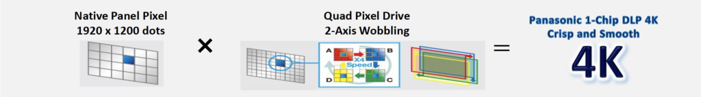 Nella sua lineup Panasonic ha introdotto la risoluzione 4K sui modelli DLP ma non su quelli LCD. Il motivo principale di questa scelta è dovuto al tempo che un proiettore impiega quando passa dal bianco al nero e viceversa: la velocità dei proiettori DLP è maggiore di quella dei proiettori LCD e questo aspetto incide sulla qualità di un’immagine 4K quando viene generata dalla tecnologia Quad Pixel Drive.