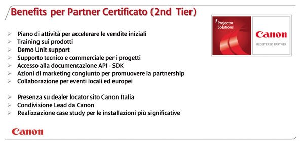La divisione ha adottato una politica capace di premiare il secondo livello, ossia il system integrator. Per questo motivo, in parallelo all’acquisizione dei distributori, è stato portato avanti il progetto Canon Projector Solution Partner. «Al momento abbiamo certificato 11 aziende specializzate nella videoproiezione – commenta Codina – con l’obiettivo di arrivare a 22 entro la fine di quest’anno e completare il percorso nel corso del primo semestre del 2015. A questo gruppo ben equilibrato dedicheremo una parte non indifferente della nostra politica commerciale. Ad esempio: potranno godere di particolari condizioni d’acquisto, l’accesso alla struttura di supporto e prevendita diretta di Canon per un supporto ai progetti più complessi, attività di co-marketing in occasione di eventi, fiere e manifestazioni, l’accesso ad un programma di unità demo e la pubblicazione di Case Study».