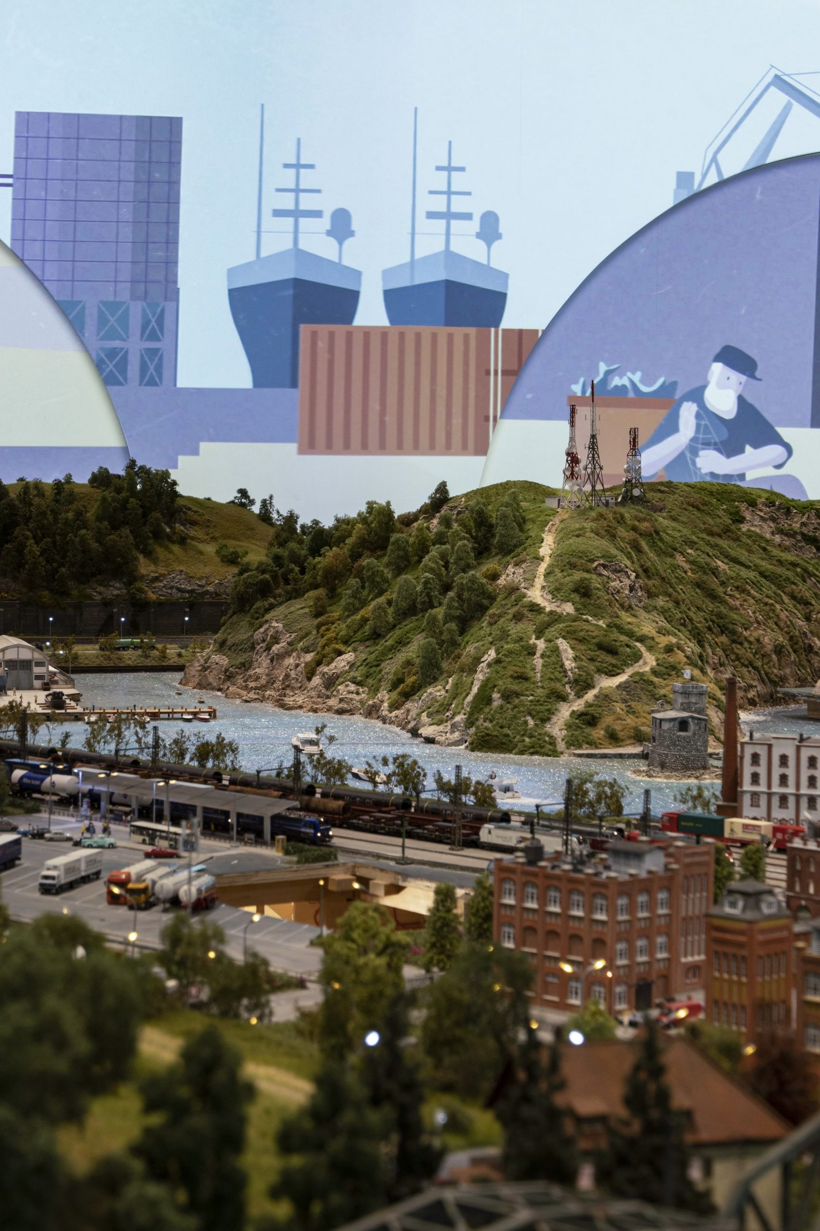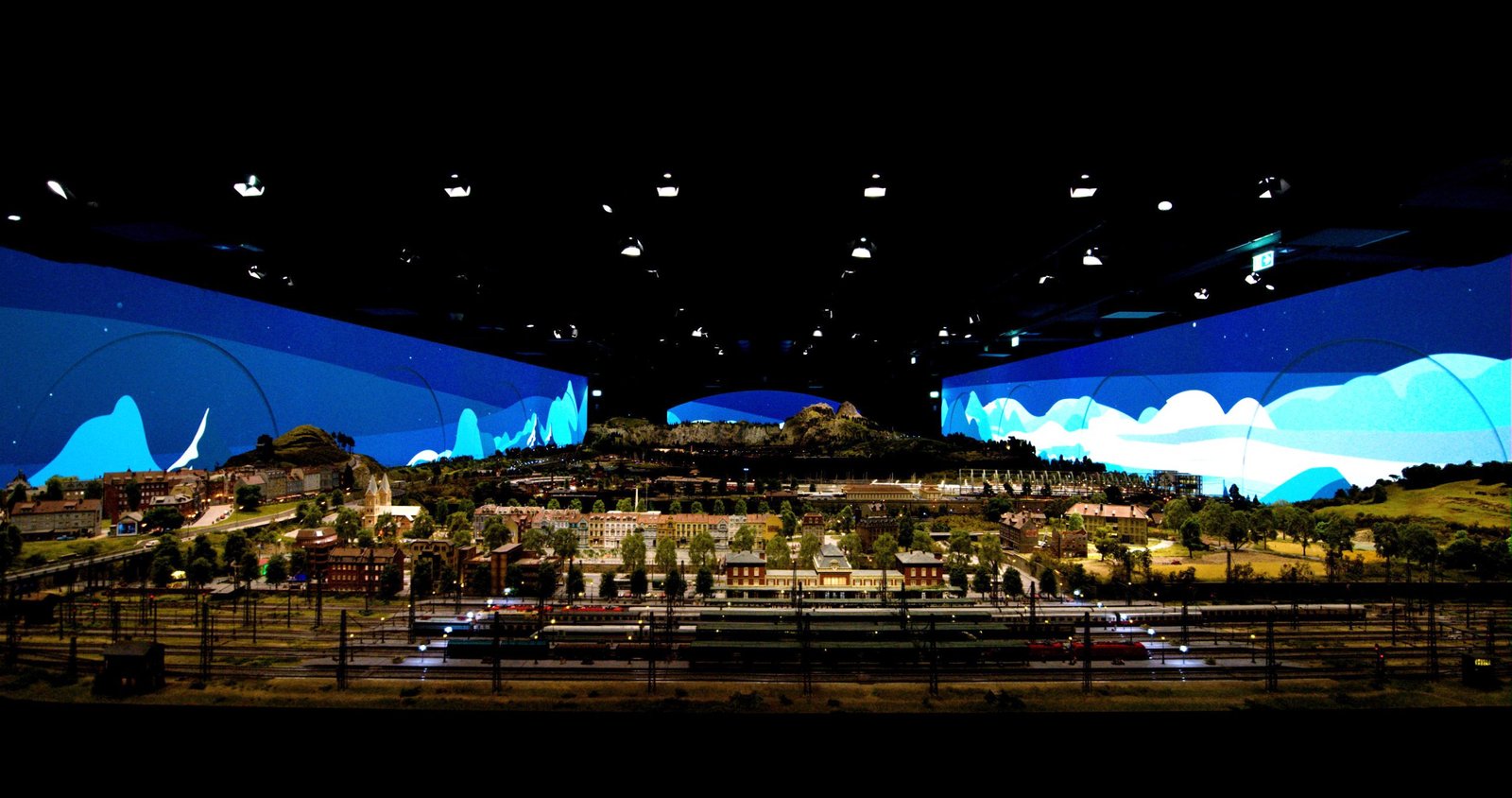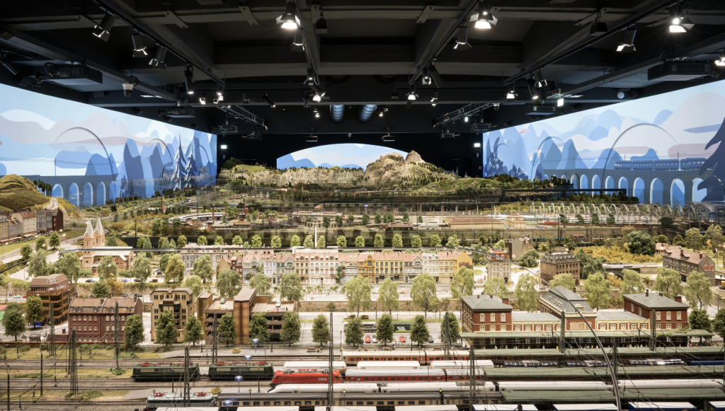Quanto è centrale, nell’esperienza di visita, la videoproiezione? «Proprio come il modellismo ferroviario coniuga una componente artigianale e una tecnologica – spiega Salvadori – allo stesso modo l’esperienza di HZERO unisce la fruizione del plastico, prodotto di altissimo artigianato, con l’esperienza visiva e sonora create da Karmachina e da Tempo Reale, esperienza che è resa possibile, dal punto di vista tecnico, dalla straordinaria qualità del lavoro di Mediacare e delle soluzioni installate. I grandi sfondi creati con le proiezioni Panasonic sono dinamici, proprio come il plastico, superando così il concetto classico di diorama. Non volevamo però che si trattasse di fotografie o immagini verosimili: abbiamo chiesto allora a Karmachina di realizzare animazioni di fantasia, che rimandassero alla realtà attraverso il medium dell’illustrazione grafica».