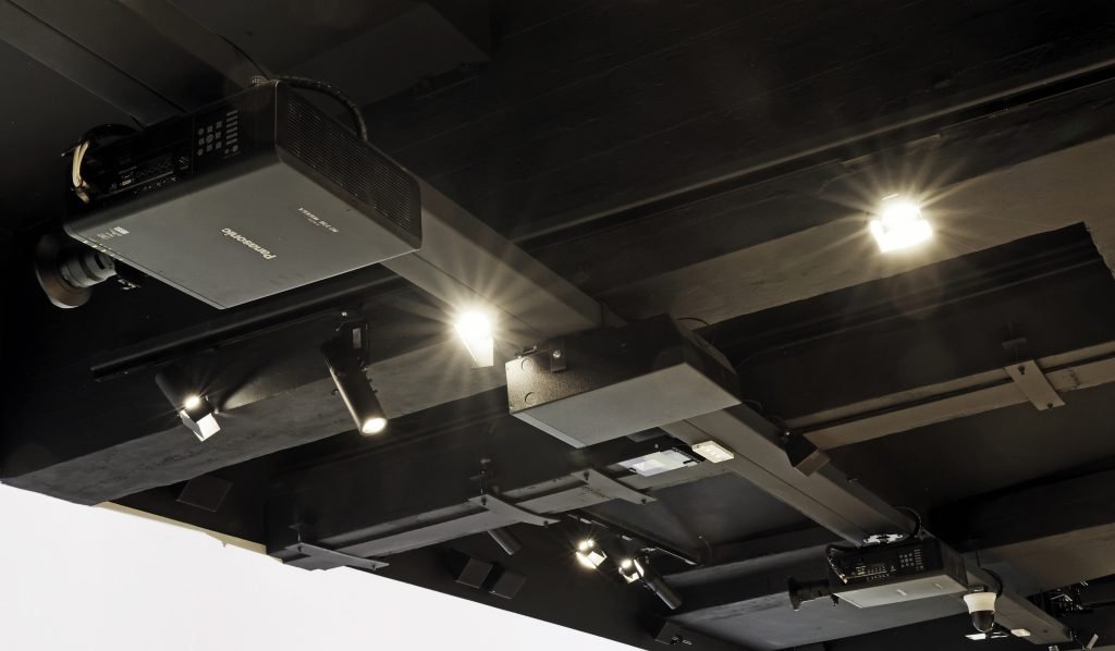 Per la creazione di HZERO, come abbiamo già sottolineato, i figli di Giuseppe di San Giuliano hanno puntato all’eccellenza in ogni ambito, e così, se per la cura del museo ci si è affidati a un fuoriclasse come Alberto Salvadori, lo stesso si è fatto dal punto di vista dell’integrazione, scegliendo di avvalersi della professionalità del team Mediacare, che lavora da anni ad altissimo livello nell’ambito dello spettacolo. Massimo Carli, fondatore dell’azienda, ci racconta che «Mediacare nasce nel 2015, quando un gruppo di professionisti, con esperienza più che trentennale nell’ambito delle soluzioni integrate per la gestione di audio, video e luci, hanno deciso di fare squadra: ciascuno di noi è esperto di un settore specifico e insieme siamo in grado di rispondere a qualsiasi esigenza che ci venga posta dall’utente finale. Il nostro ambito d’elezione è lo spettacolo, ma ci occupiamo anche di illuminazione architetturale, spazi commerciali, centri congresso, impianti sportivi, musei, scuole e università». La realizzazione di HZERO è stata la prima collaborazione tra il team Mediacare e Alberto Salvadori ma, stando a quanto dichiarato da entrambi nelle rispettive interviste, di sicuro non sarà l’ultima. «Il contatto con Salvadori è nato grazie a Tempo Reale, lo studio incaricato di realizzare la colonna sonora di HZERO: noi collaboriamo da anni con Tempo Reale e sono stati loro a suggerire al curatore Salvadori di rivolgersi a noi per la gestione tecnica audio e video: ne è nato un rapporto di grande stima reciproca, che credo sia destinato a durare a lungo. La richiesta era quella di realizzare un’installazione che fosse al contempo di grande impatto, di semplice gestione, interamente automatizzata (perché il museo non prevedeva di assumere tecnici audio e video nel proprio personale) e, soprattutto, affidabile, dato che la componente audio-video è cruciale per la riuscita della visita. Non sempre è immediato coniugare performance elevate a semplicità e affidabilità, ma noi veniamo tutti dal mondo dello spettacolo, dove questo genere di esigenza è il pane quotidiano. Il progetto video, dalla programmazione del widget alla proiezione, è stato realizzato da Davide Broccoli che, all’interno di Mediacare si occupa di videoproiezione. Dal punto di vista tecnico, si trattava di proiettare su tre pareti, due da 26 e una da 13 metri, per un’altezza di circa 3 metri e 20 (In realtà – precisa Massimo Carli – la sala è molto più alta di così, ma sul soffitto ci sono impianti di aspirazione molto ingombranti, che ostacolano la proiezione). Abbiamo suddiviso idealmente ciascuna parete in quadri da 5 metri x 3,20, da coprire mediante proiezioni in blending: in questo modo siamo riusciti anche a superare l’ostacolo costituito da due porte presenti sul lato corto. La proiezione è effettuata mediante dodici proiettori Panasonic PT-RZ790, cinque per i lati lunghi e due per il lato corto».
