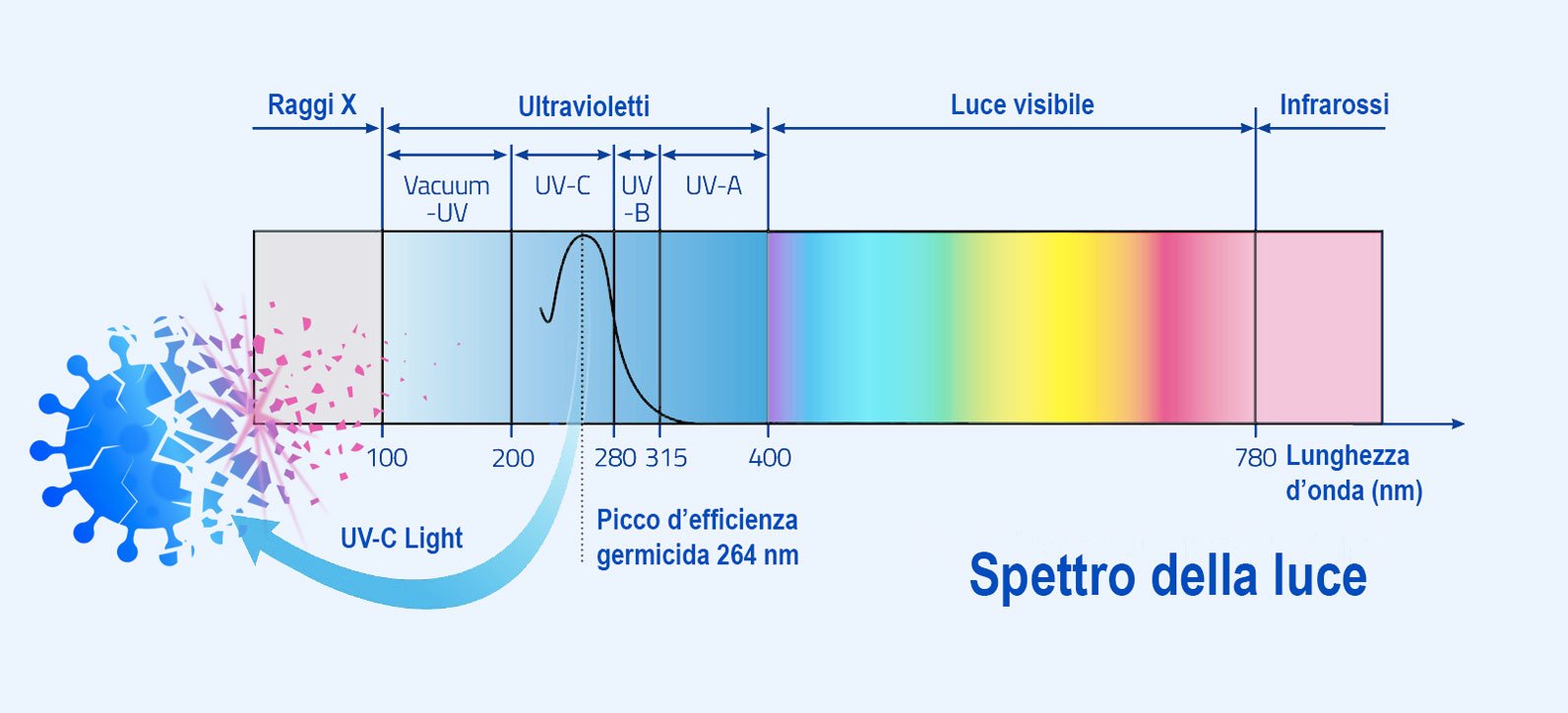Il potere germicida della luce UV-C su batteri e virus è ben noto, proprietà dovute alla sua capacità di rompere i