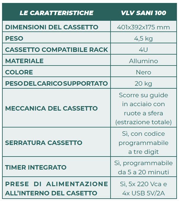Il cassetto VLV Sani 100 si può montare, con un accessorio dedicato, sotto il piano della cattedra o integrato in un rack/mini rack (4U) con ruote a pavimento nel caso vi sia la necessita di ospitare altri apparati, ad esempio sotto la scrivania, dove generalmente viene posizionata la cassettiera.